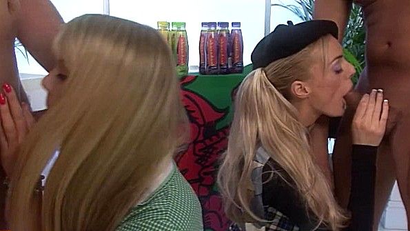 Two glamorous girlfriends decided to seduce a young guy into group sex and bared their breasts in front of him